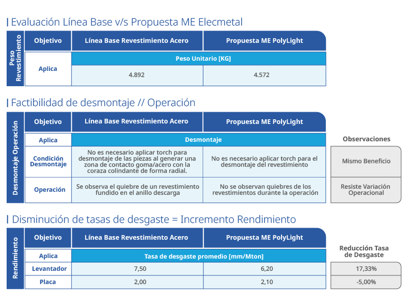 • Queda demostrado que con producto PolyLight no es necesario afectar el volumen interno del molino (manufacturar revestimientos de mayor espesor) para alcanzar la duración esperada y disminuir la probabilidad de quiebres.